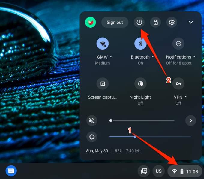 Tap your Chromebook’s Status Area (bottom-right side of the screen) and select the power button. Alternatively, hold your Chromebook’s power button and select Power off.