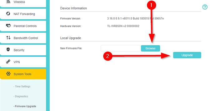 You may even choose to flash custom firmware such as DD-WRT or Tomato. Go to either DD-WRT or Tomato’s website and search for your router’s model number. Download the .bin file and look for a section called Firmware Upgrade or something similar. Browse the .bin file and upgrade.