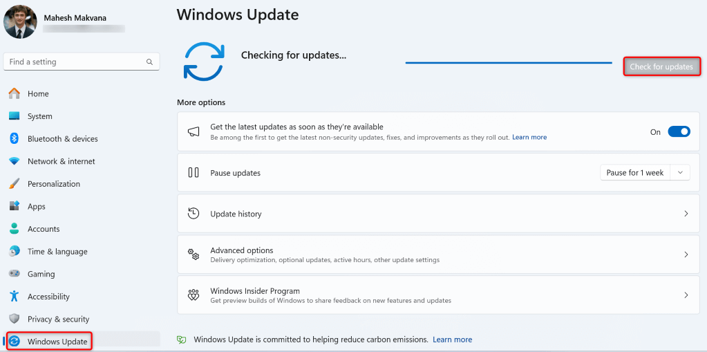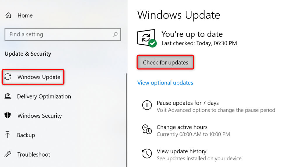 - Open Settings using Windows + I. * Select Update & Security in Settings. * Choose Windows Update in the left sidebar. * Select Check for updates on the right pane.