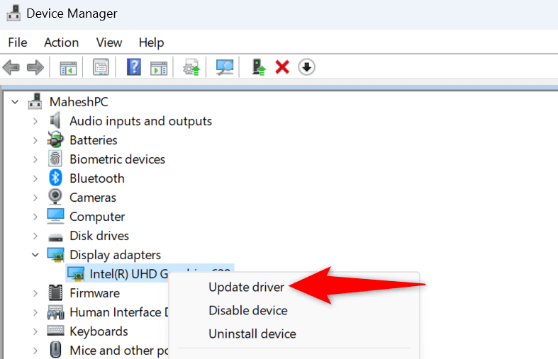 - Expand Display adapters, right-click your graphics card, and select Update driver.