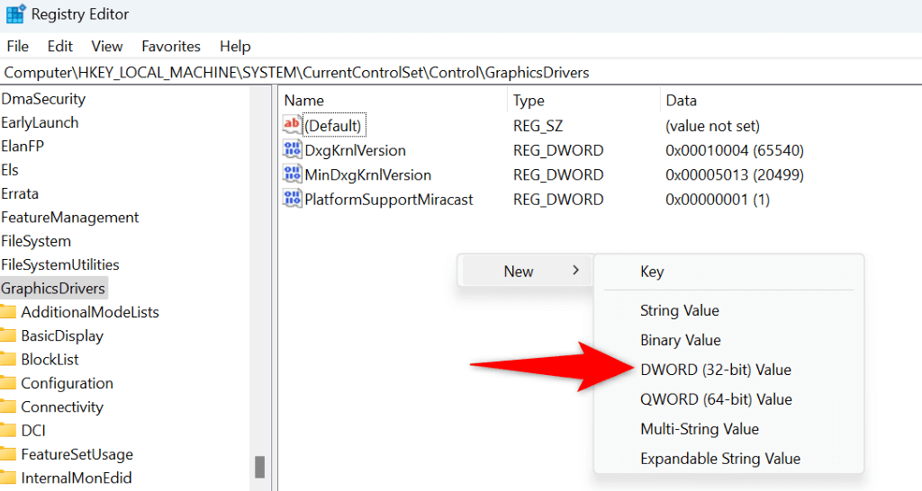 - Head to the following path in Registry Editor: HKEY_LOCAL_MACHINE\SYSTEM\CurrentControlSet\Control\GraphicsDrivers