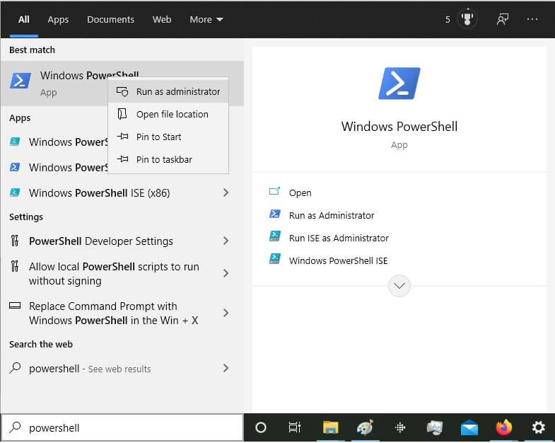 - Right-click on Windows PowerShell and select Run as administrator.