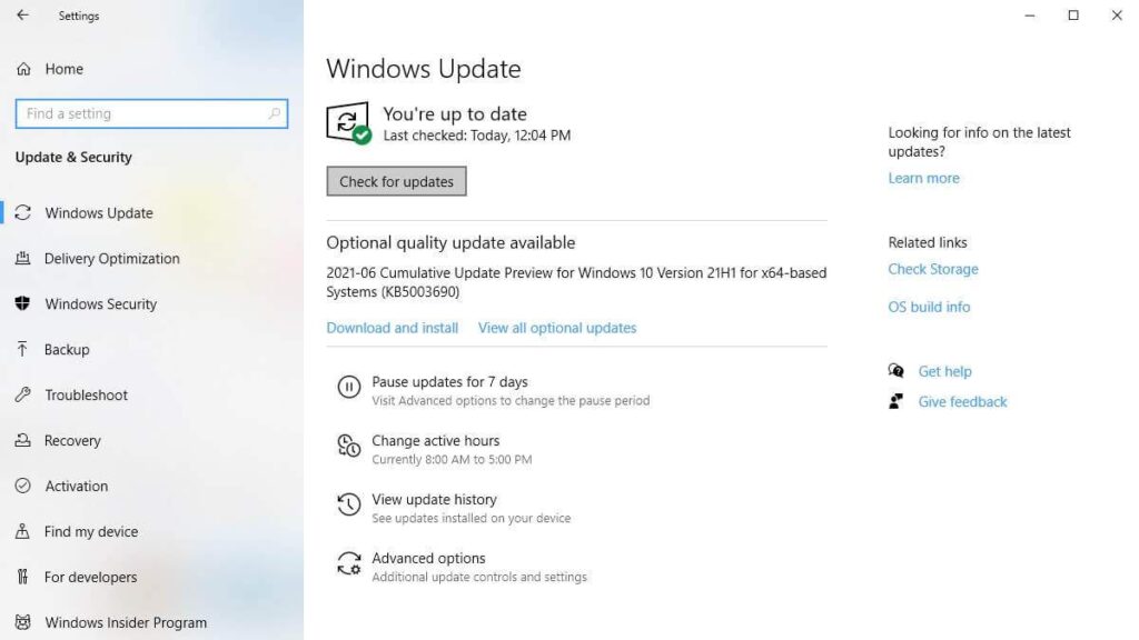 - Select **Update & Security **>** Windows Update **> **Check for updates**.
