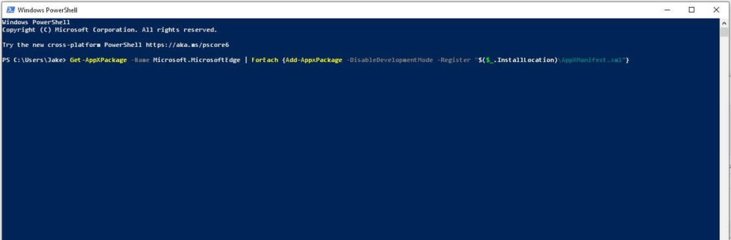 Get-AppXPackage -Name Microsoft.MicrosoftEdge | ForEach {Add-AppxPackage -DisableDevelopmentMode -Register “$($_.InstallLocation)\AppXManifest.xml”}