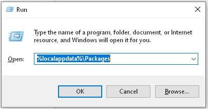 - Press **Windows** + **R**. This should open the run command box. * Type: **%localappdata%\Packages\ **and hit enter.