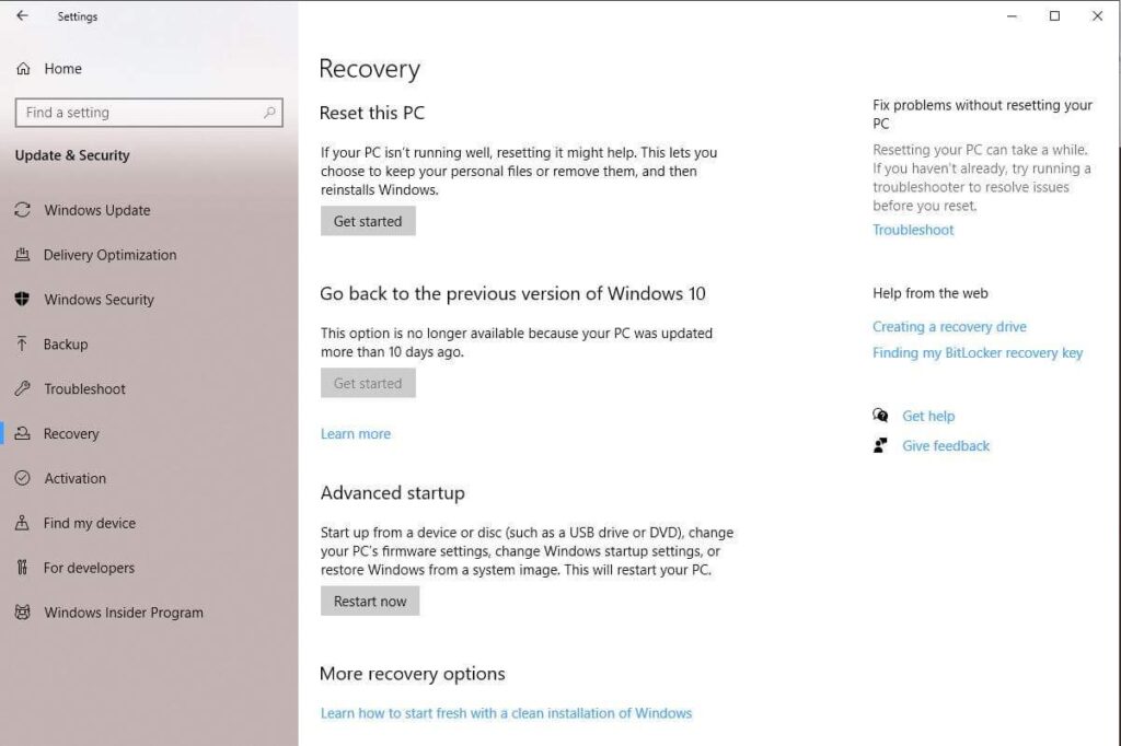 - Select **Recovery** in the left sidebar. * Under **Advanced Startup **select **Restart now**.