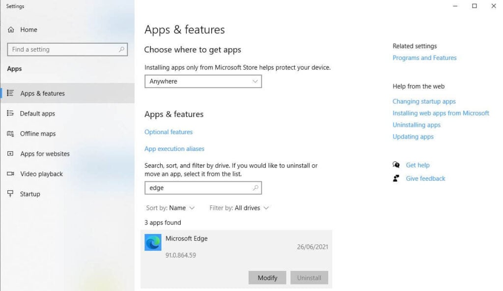- Click on Microsoft Edge and select Modify.