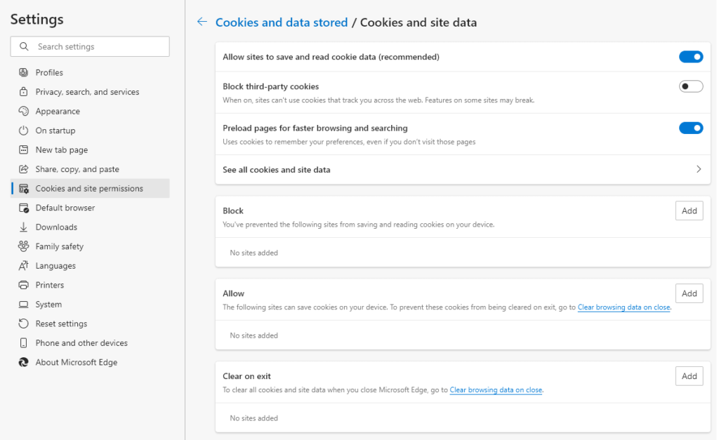 - Select **Settings **> Cookies and site permissions > Manage and delete cookies and site data > See all cookies and site data.