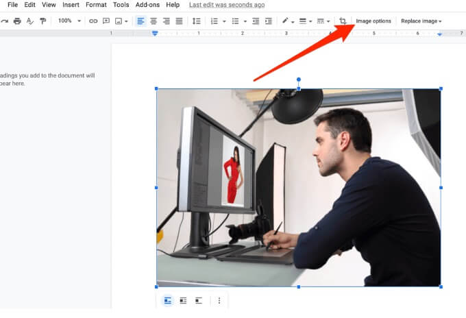 - Select Insert > Image to open your image. Click on the image and then select the Image Options button in the toolbar.