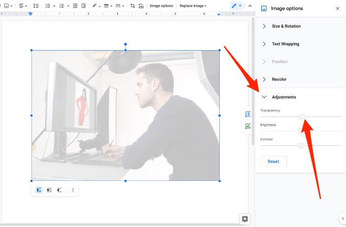 Google Docs offers some basic tools that help you make an image transparent and add it anywhere in your document.