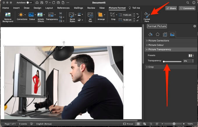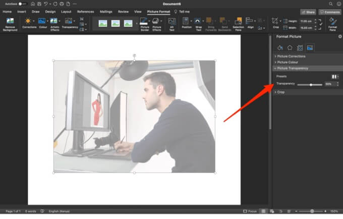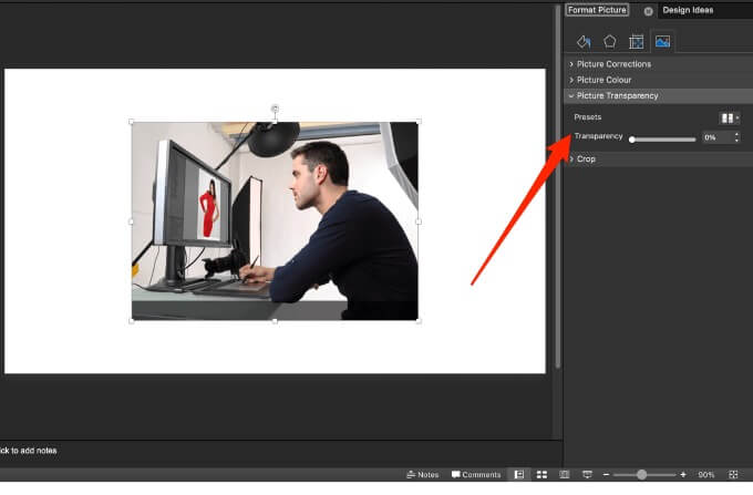 - Drag the **Transparency** slider in the **Format Picture** pane.