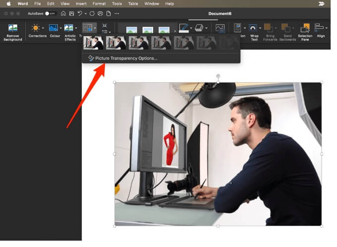 - Alternatively, you can customize the transparency level by selecting **Transparency** > **Picture Transparency Options.**