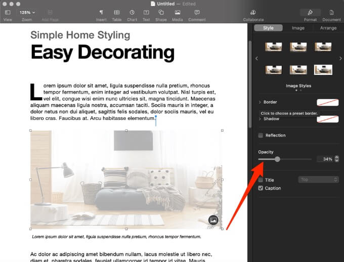 - Select your image and then drag the **Opacity** slider under the **Style** tab to make the image transparent.