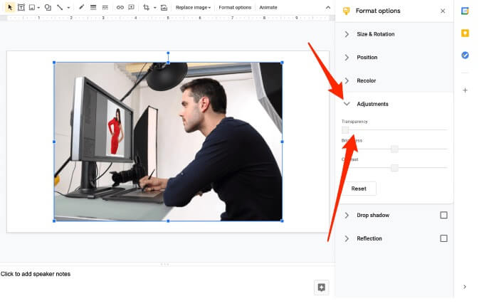 - Next, select **Adjustments** and then adjust the **Transparency slider** to the desired opacity. Once you’re done, close the Image Options column.
