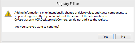 Now just double-click on the file wherever you saved it and you’ll get the following dialog warning you about adding stuff to your registry: