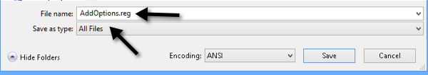Now click File – Save. Here you can give the file any name you like. The main thing is to change **Save as type **to All Files and to give the file name an extension of .reg.