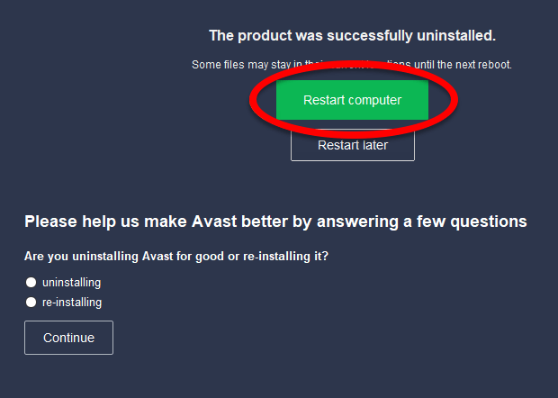 - Once uninstalled, select **Restart computer** and reinstall Avast.