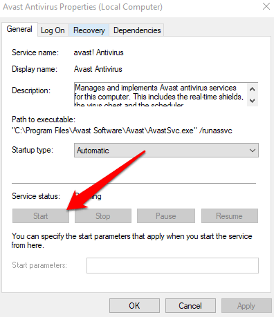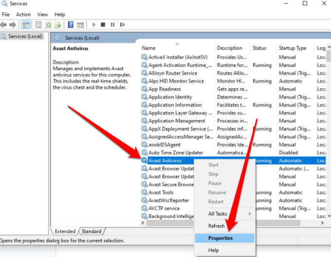 - Find **Avast Antivirus **service in the Services window, right-click the service, and select **Properties**.