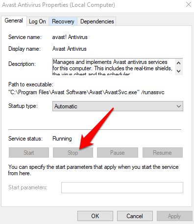 - Check the **Service****status** to see if it says **Started** and select **Stop** to stop it from running.