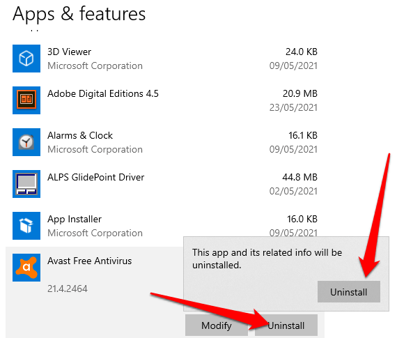 - Right-click Start > Apps & Features > Avast Antivirus > **Uninstall **> Uninstall when the Avast Antivirus setup appears.