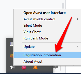 - Right-click the Avast icon in the Windows taskbar area and select Registration****Information.