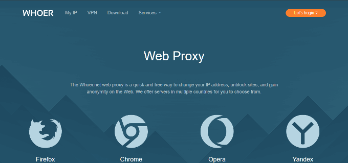 The Whoer proxy server is available for the Google Chrome, Firefox, Opera, and Yandex browsers.