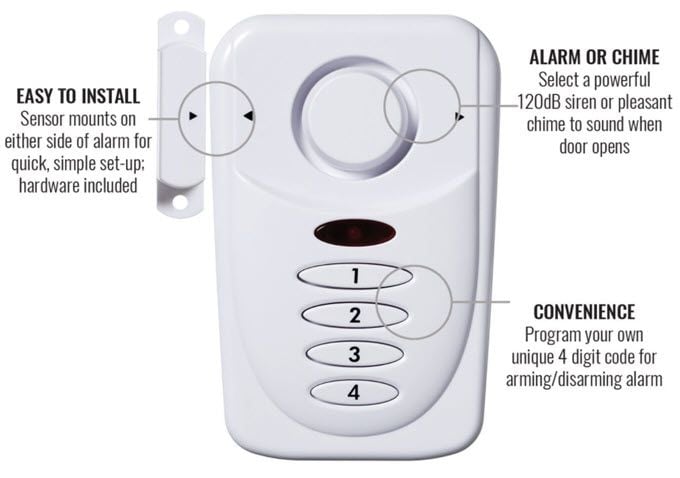 You’ll find some people using it as a cheap way to secure their homes. You can add it to any door in the house, and you can arm and disarm it the same way you would any house alarm — using a four-digit code.