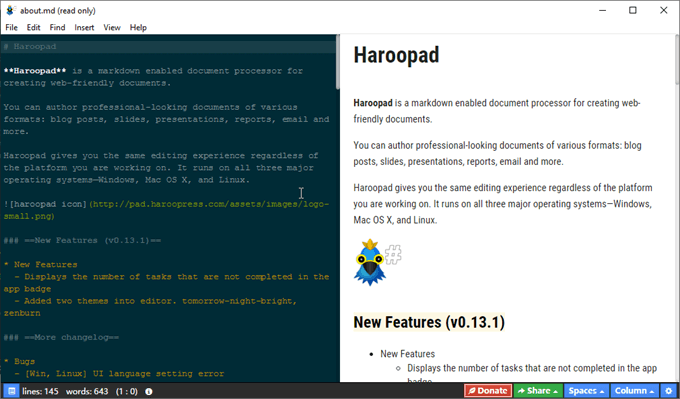 This is one of the more full-featured Markdown editors on the list. Along with standard features like autocomplete and themes, Haroopad also allows for embedding online content like YouTube, Instagram, and Twitter.