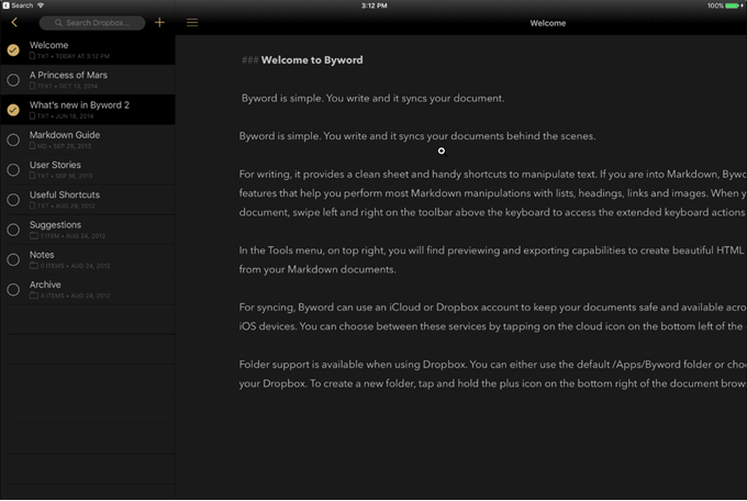 Byword might be the right Markdown editor for you if you move from your Mac to iPhone or iPad a lot. It can sync across Apple devices. Byword also allows export to PDF and HTML documents, and publishing to your favorite blogging platforms like WordPress, Blogger, Medium, and even Evernote.