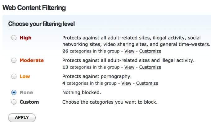- Click the **network **and pick from one of four filtering levels: High, Moderate, Low or None. Each level protects against specific types of content or sites. For example, Low only protects against porn, while High protects against adult-related sites, social networking sites, illegal activity, video sharing and more.