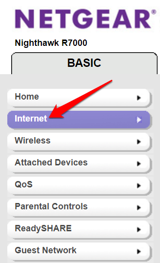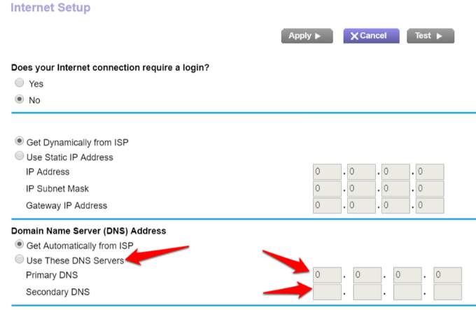 - For your router, type the IP address, log in and go to DNS settings and use any of the two IP addresses in place of the default one your ISP provided. On a Netgear router, log in and go to Basic>Internet.
