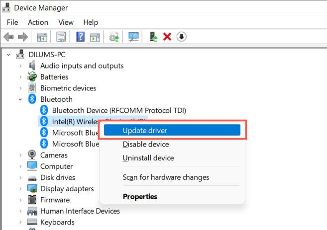 Right-click the Bluetooth adapter—e.g., Intel(R) Wireless Bluetooth(R)—and select Update driver.