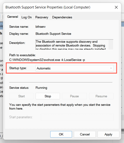 If that helps, ensure that the Bluetooth service above is always set to run at startup. To do that: