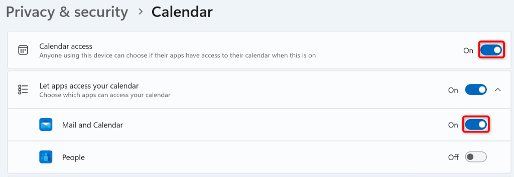 - Choose Let apps access your calendar and turn on the toggle next to Mail and Calendar. This gives the Calendar app access to your account calendar.