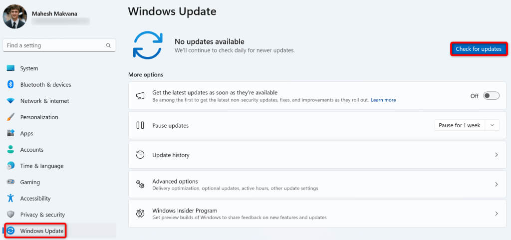 - Choose the Check for updates button on the right pane.