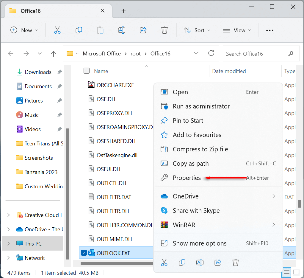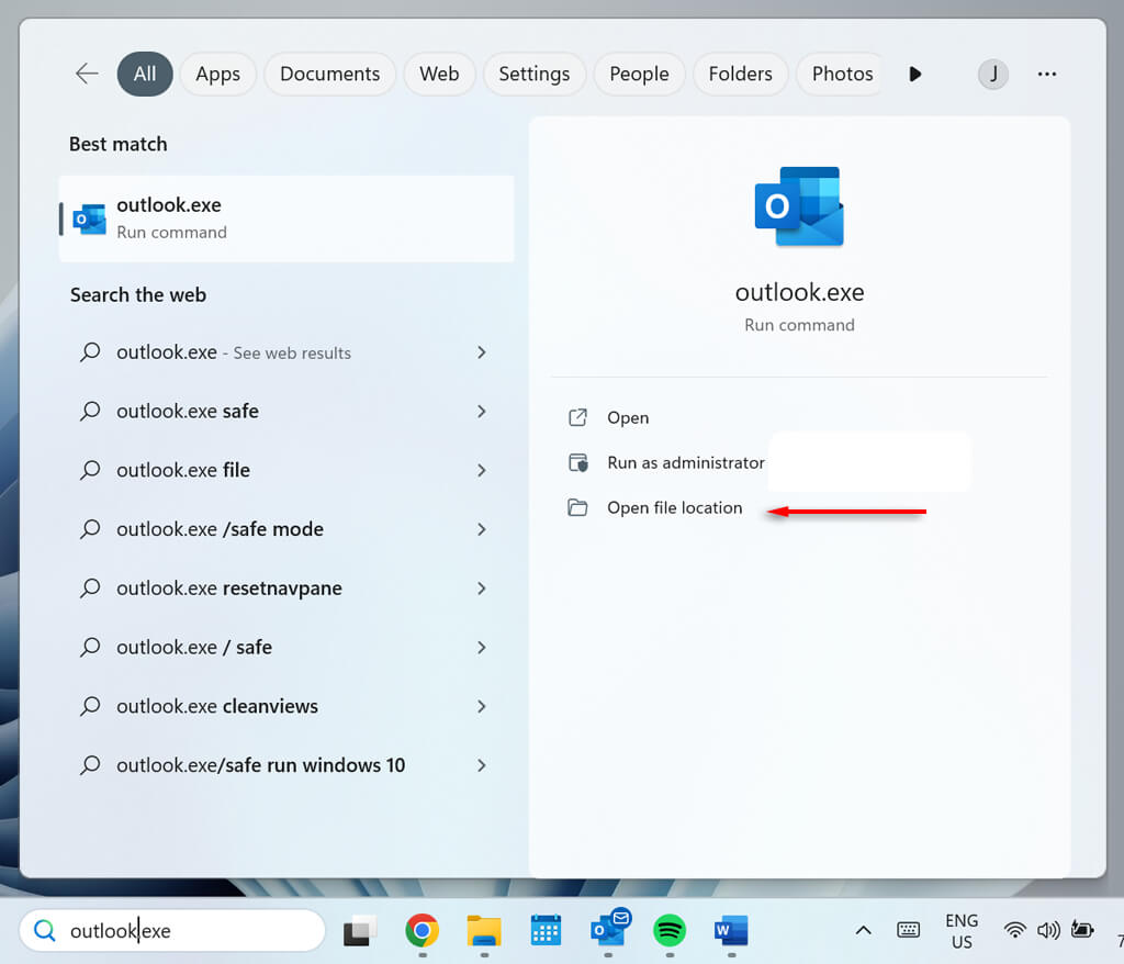 - Open the Start Menu and search for Outlook. Select Open file location.