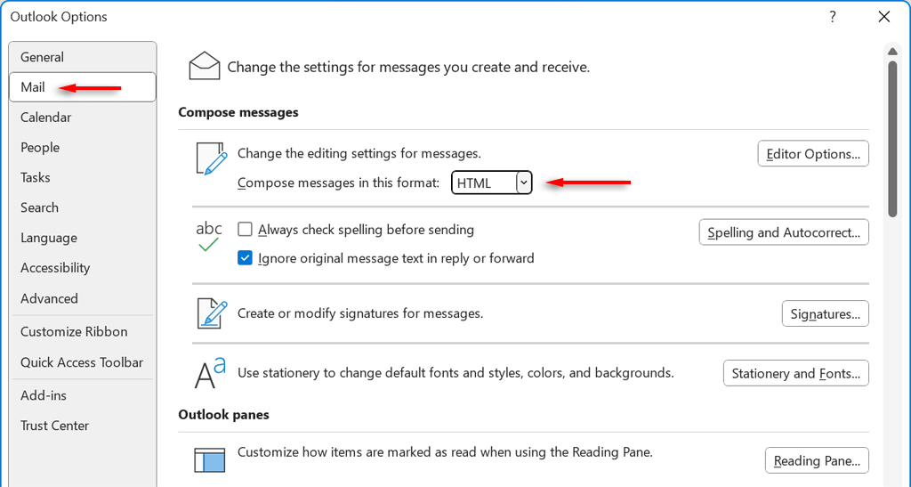 - In the new dialog box, select Mail. * Under Compose Messages select the drop-down next to Compose Messagesin this format. * Select the HTML or Plaintext option.