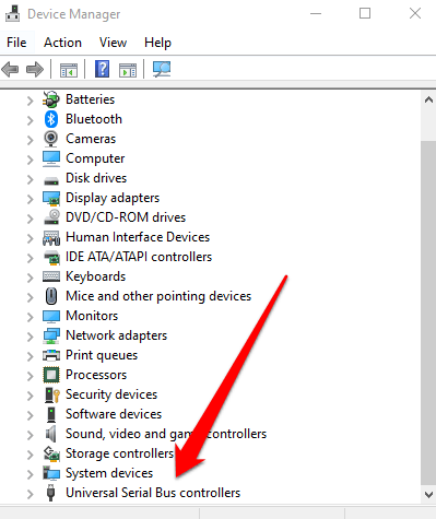- Select the **Universal Serial Bus Controllers** list to expand it and then check if there’s a yellow exclamation mark next to any of the entries.