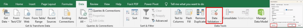 - Click the Data tab, then choose Data Validation under Data Tools.