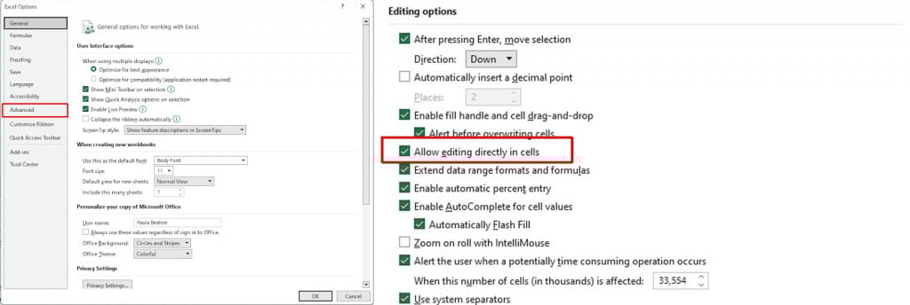 - Under Editing Options, ensure the Allow Editing Directly in Cells box is checked.