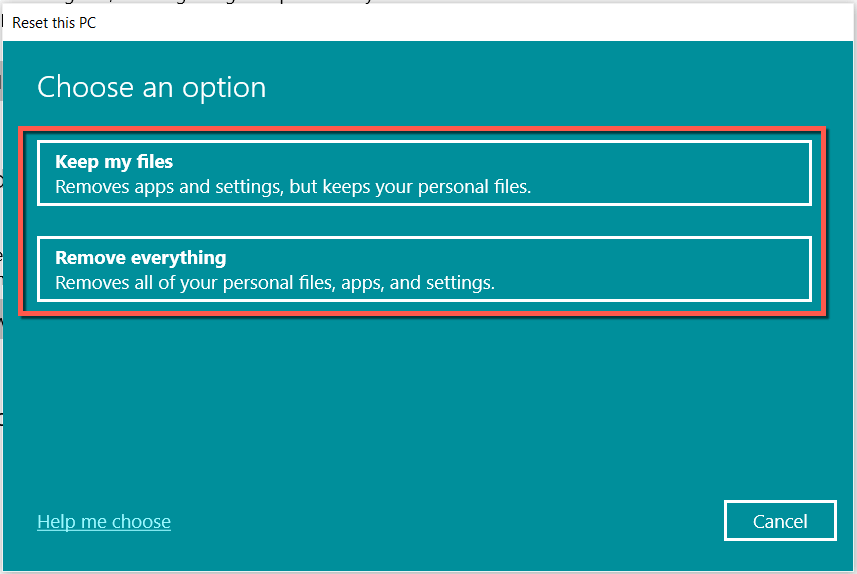 - Pick between the Keep my files and Remove everything options and wait until Windows resets itself.