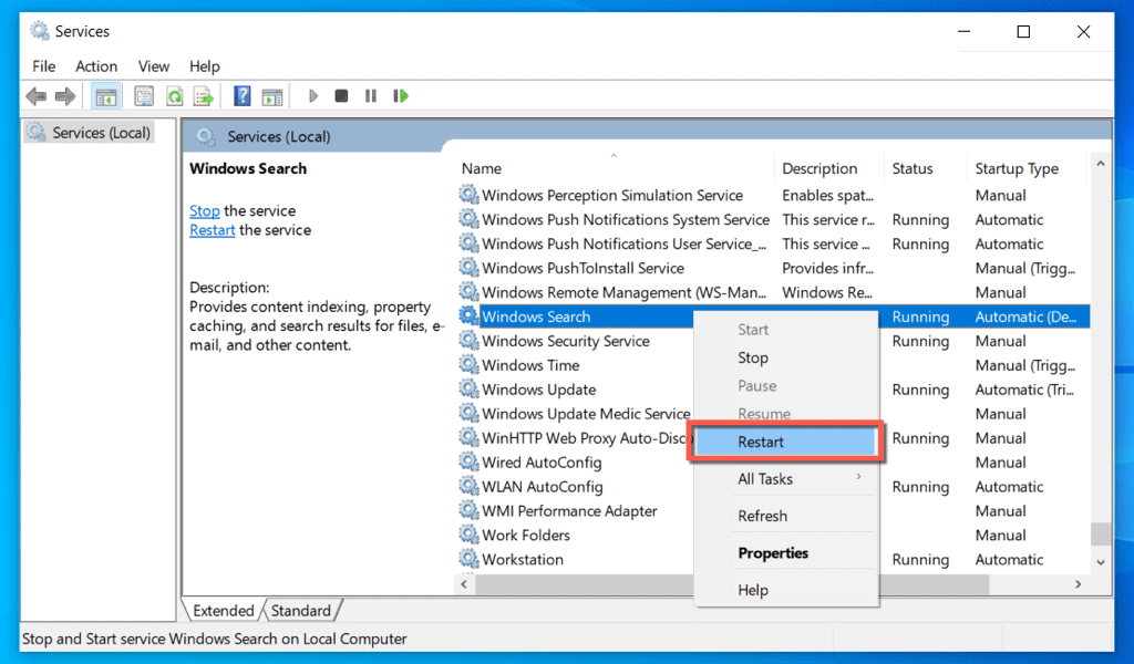 - Right-click Windows Search and select Restart.