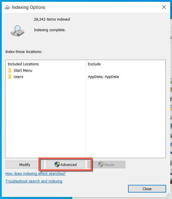 - Wait until Windows Search rebuilds its index. * Select Close to exit the Indexing Options dialog.
