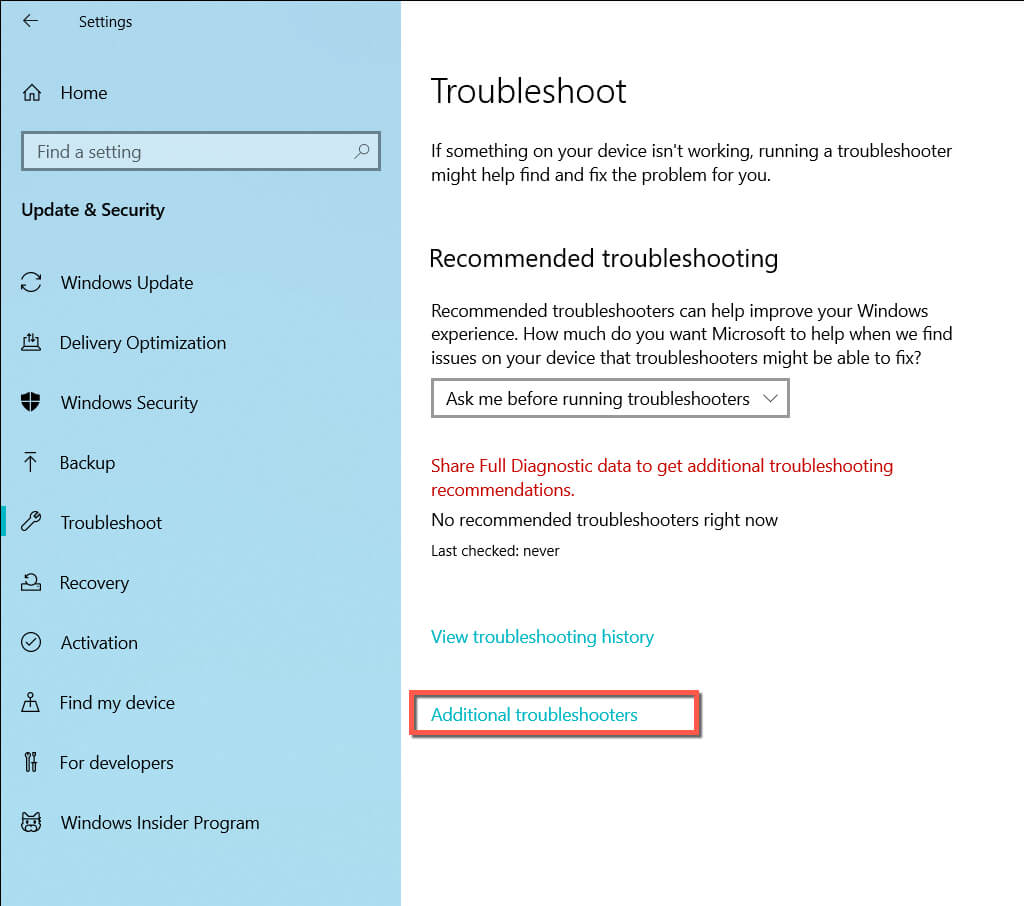 - Select Troubleshoot > Additional/Othertroubleshooters.