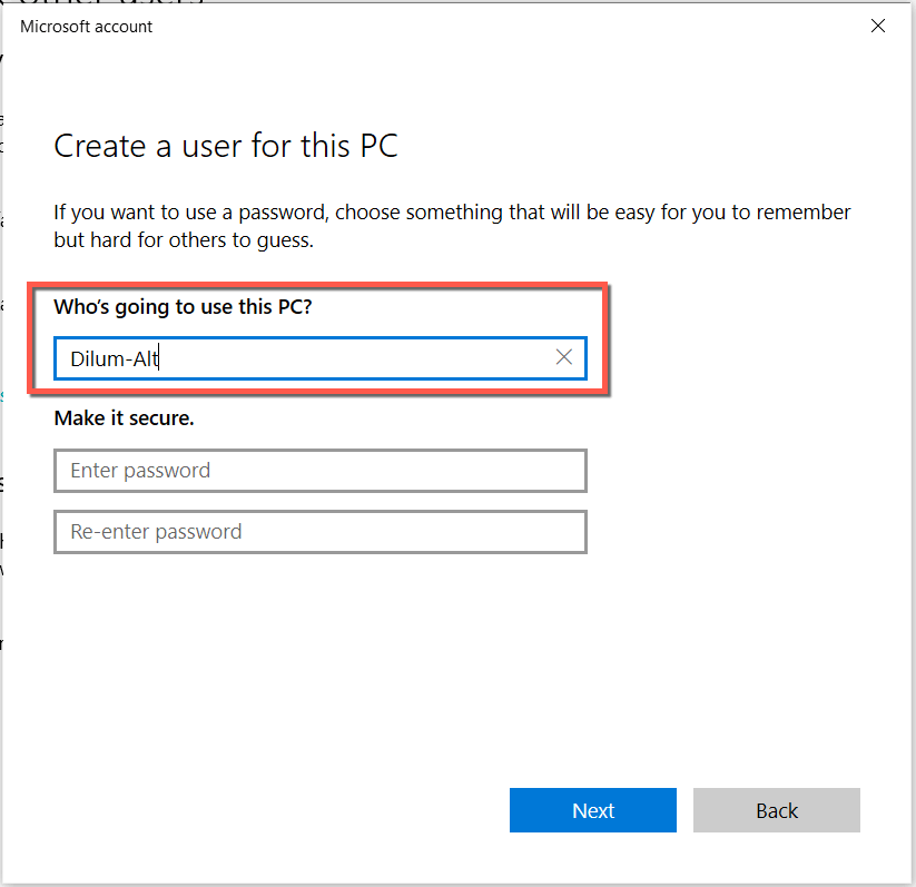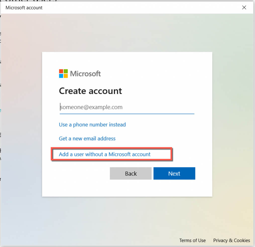 - Select Add a user without a Microsoft account.