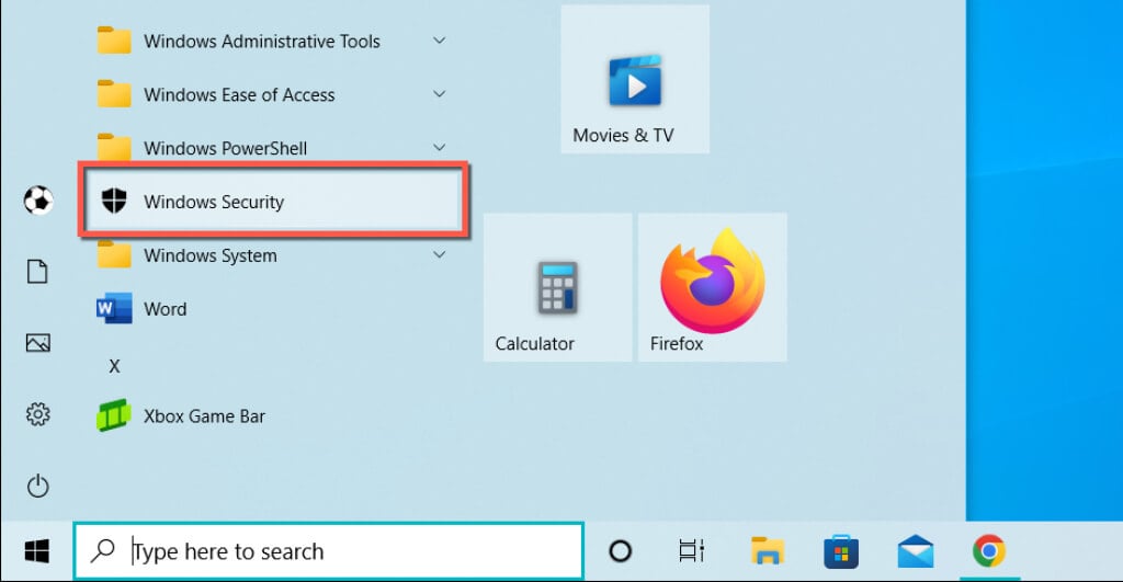 - Open the Start menu and select Windows Security on your programs list.