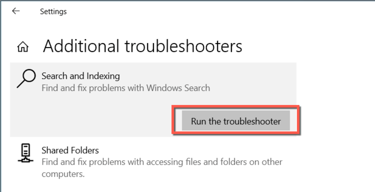- Select Search and Indexing > Run the troubleshooter.