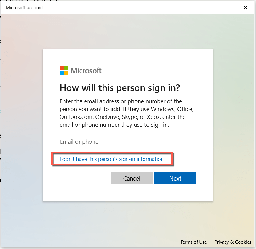 - Select I don’t have this person’s sign-in information.
