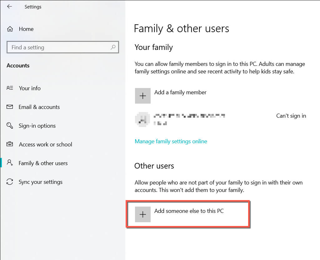 - Select Add someone else to this PC/Add account under the Other users section.