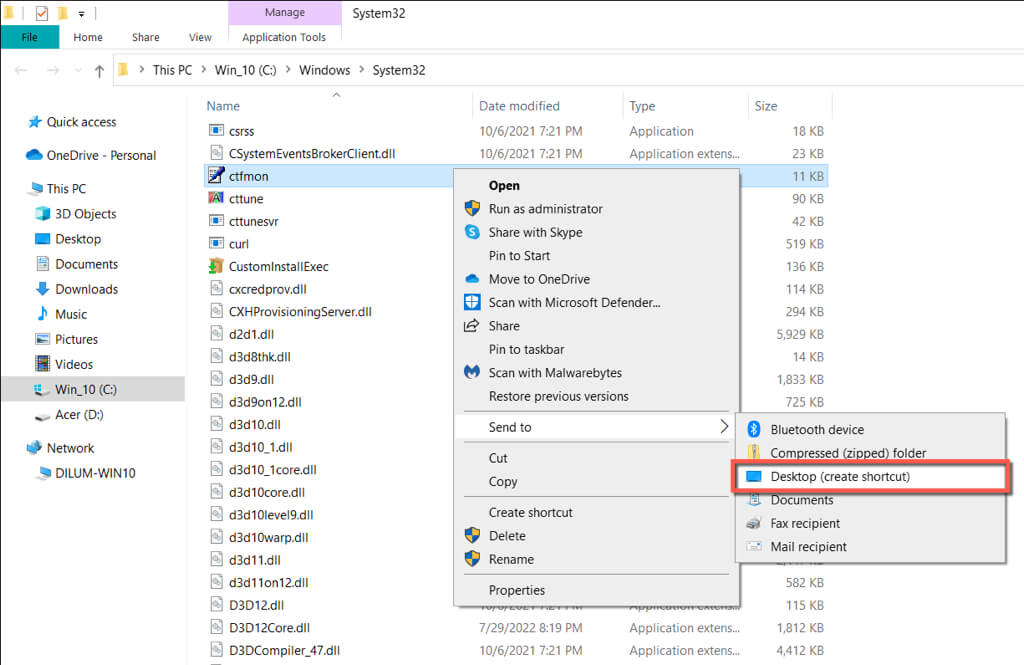- Locate and right-click ctfmon.exe and select Show more options (Windows 11 only) > Send to > Desktop (create shortcut).